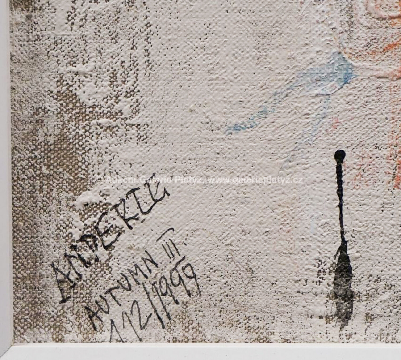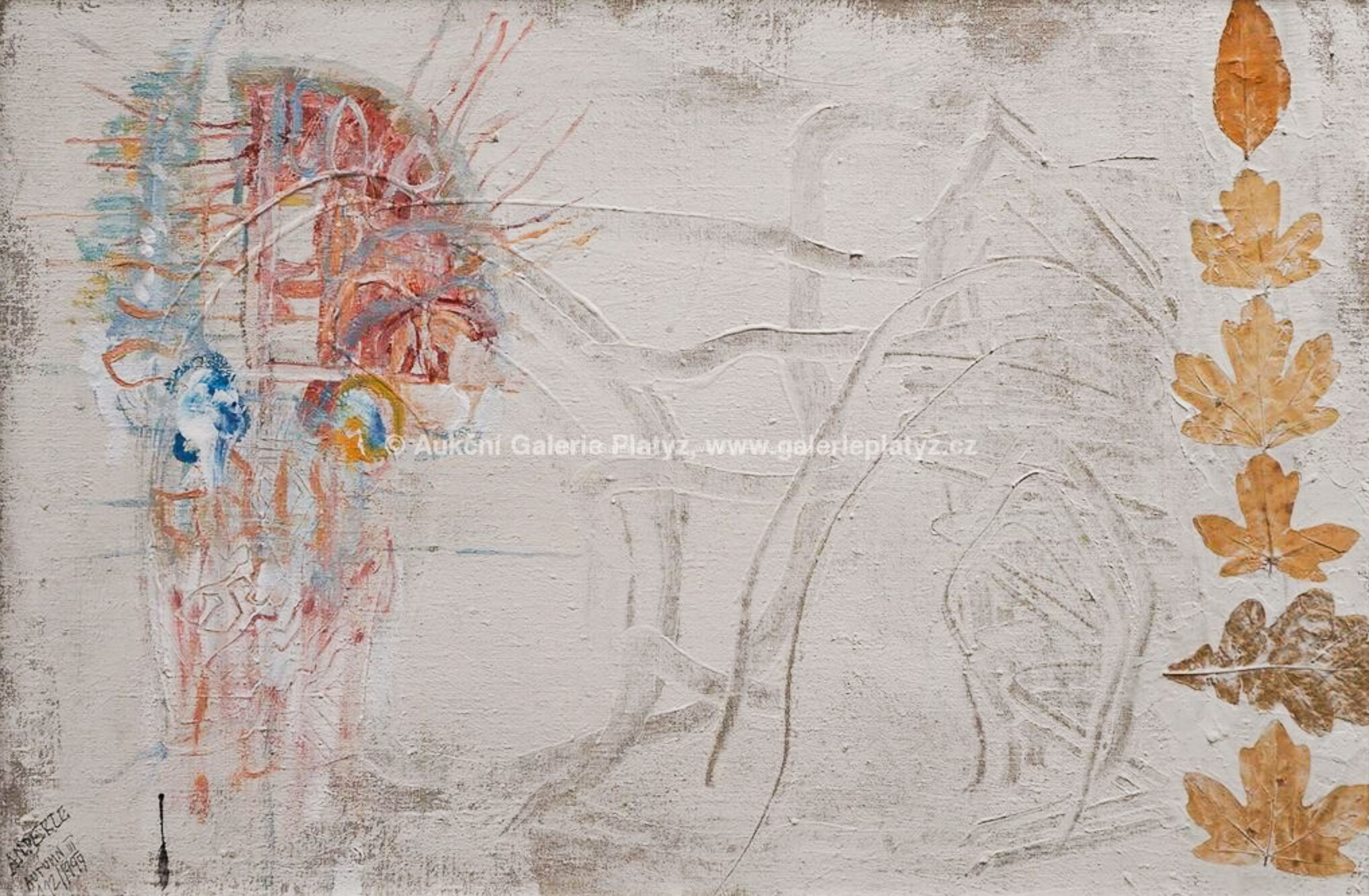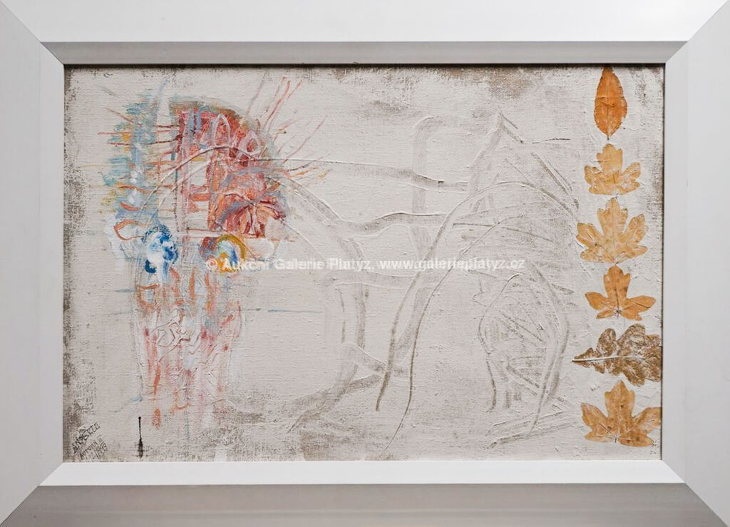malba/plátno/koláž s listy, rozměr 40 x 60 cm, značeno, datováno a popsáno vlevo dole, popsáno na zadní straně, oděrky na rámu, obraz ve velmi dobrém stavu viz foto