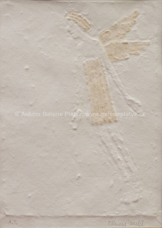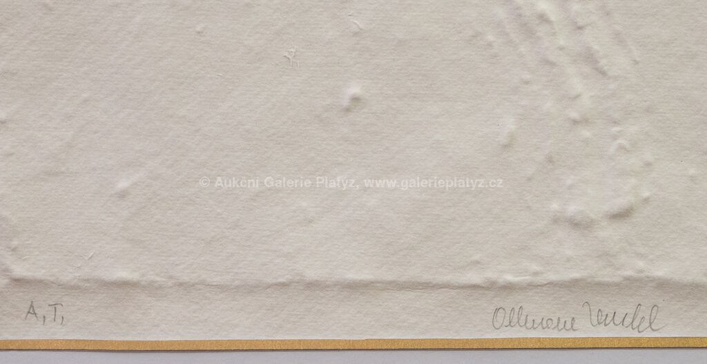 papírový reliéf, ruční papír/zlato, rozměr ve výřezu 31,5 x 22,5 cm, značeno a popsáno ve spodní části, paspartováno, zaskleno, rámováno, konzultováno a pravost potvrzena Nadačním fondem Kmentová Zoubek, (vznik 1995)