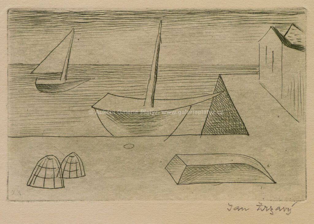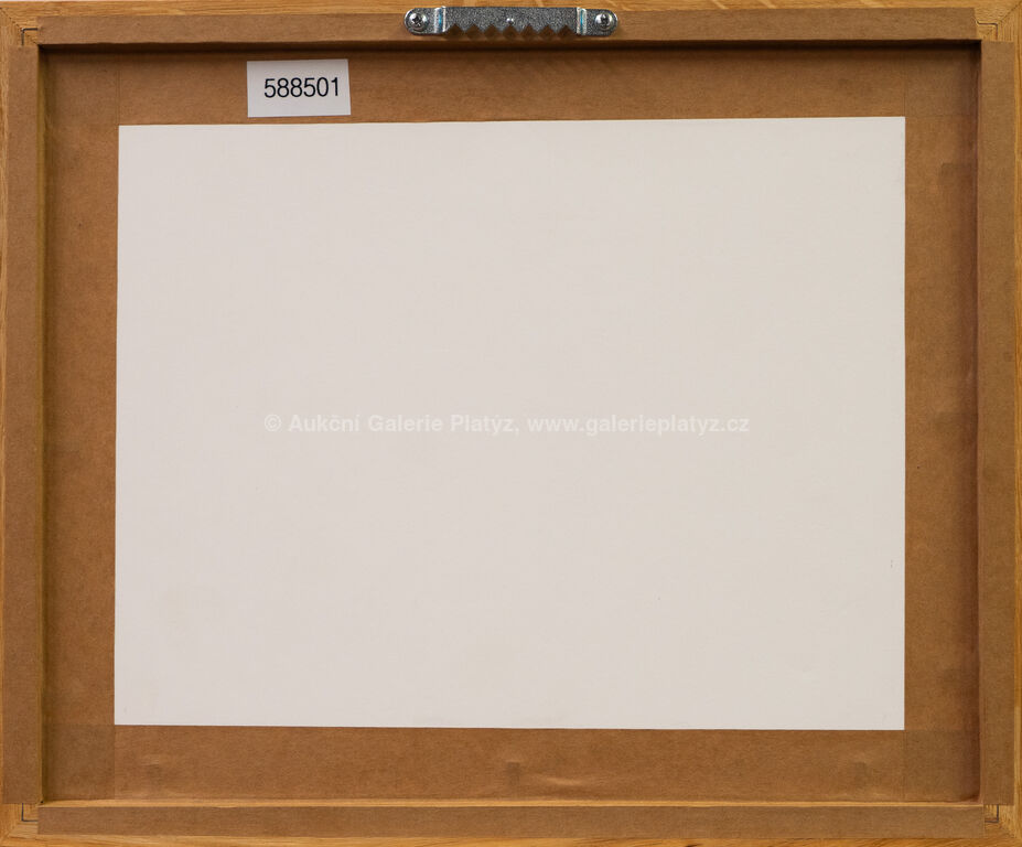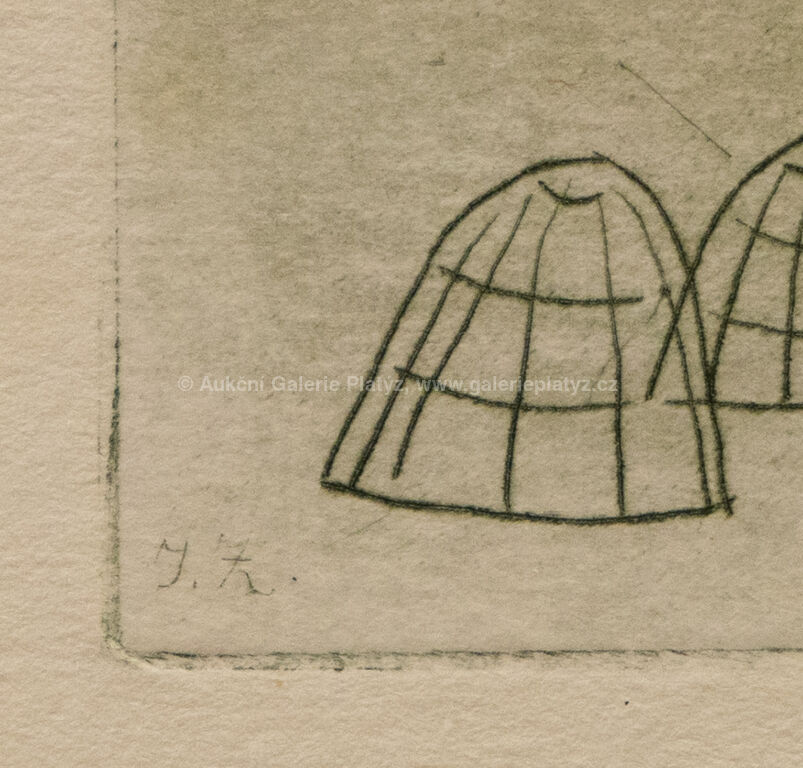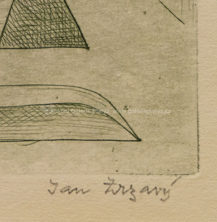 suchá jehla/papír, rozměr ve výřezu 12 x 16,5 cm, značeno vlevo dole v tisku, vpravo dole tužkou, paspartováno, zaskleno, rámováno, vznik 1947, v soupisu grafického díla Jana Zrzavého sepsaného Františkem Dvořákem pod číslem 24