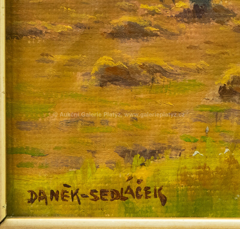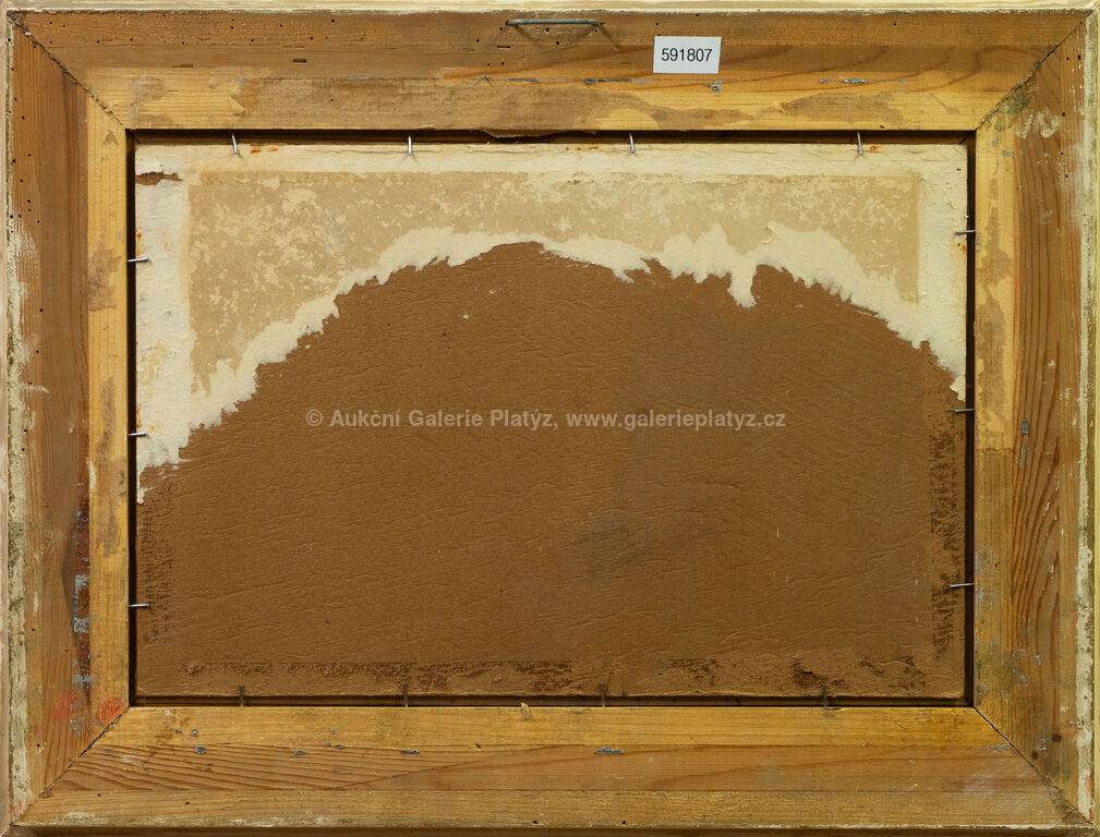 olej/karton, rozměr 27 x 41 cm, značeno vlevo dole, zaskleno, rámováno, poškozený rám, na několika místech zvlněný karton
