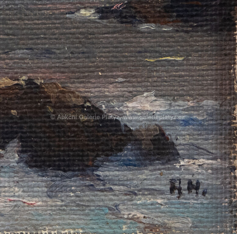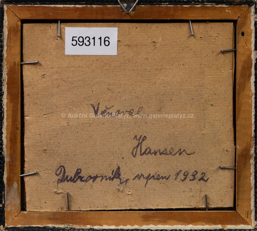 olej/plátno fixované na kartonu, rozměr 12 x 13,5 cm, značeno vpravo dole, zaskleno, rámováno, datum a věnování na zadní straně