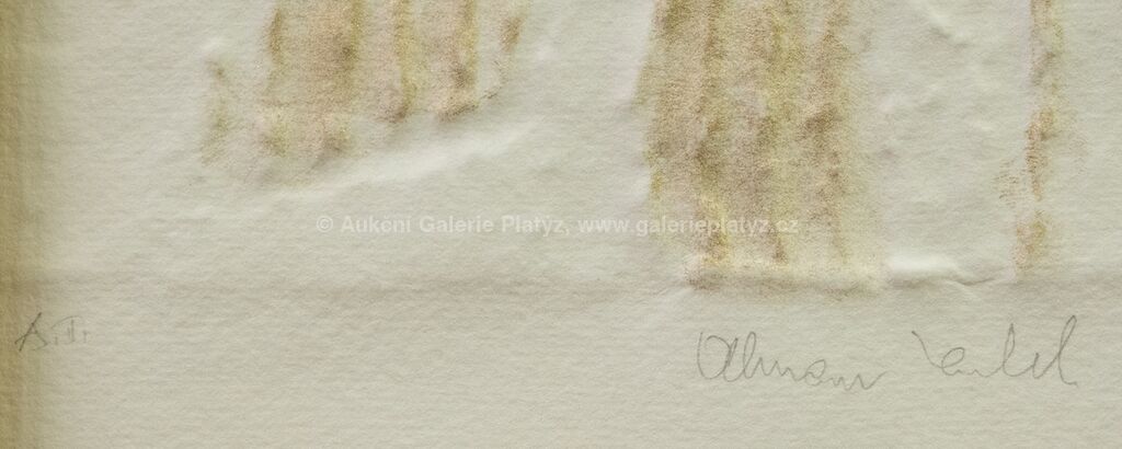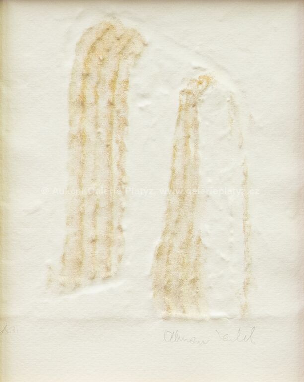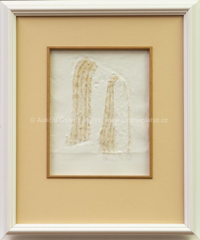 papírový reliéf/zlato/ruční papír, rozměr ve výřezu 18 x 14,5 cm, značeno a popsáno ve spodní části, paspartováno, zaskleno, rámováno, konzultováno a pravost potvrzena Nadačním fondem Kmentová Zoubek (vznik 1996)