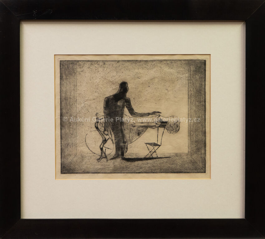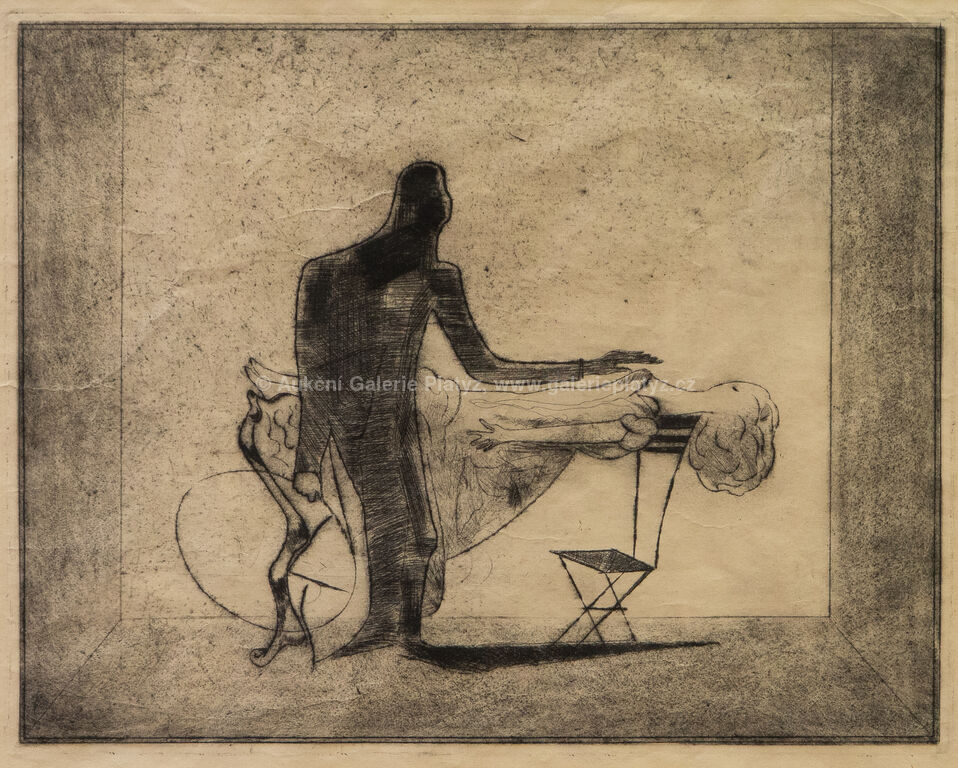 suchá jehla/papír, rozměr ve výřezu 29,5 x 36,5 cm, neznačeno, paspartováno, zaskleno, rámováno, publikováno v knize František Tichý Grafické dílo, č. 167, str. 127