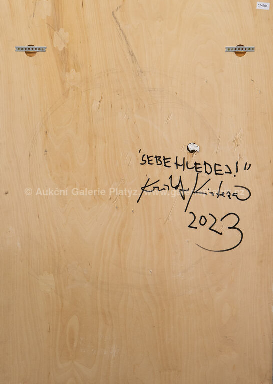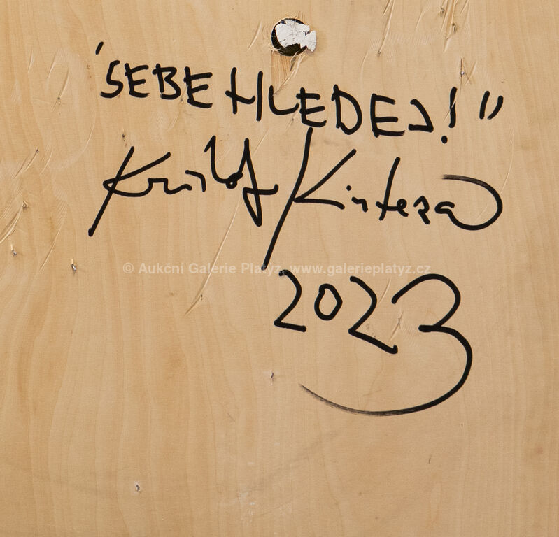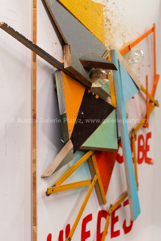 kombinovaná technika, asambláž/dřevěná deska, rozměr 103 x 73 cm, značeno, datováno a popsáno na zadní straně