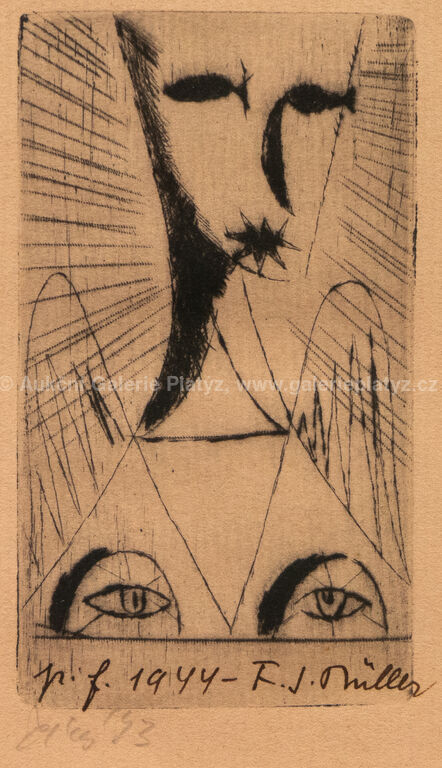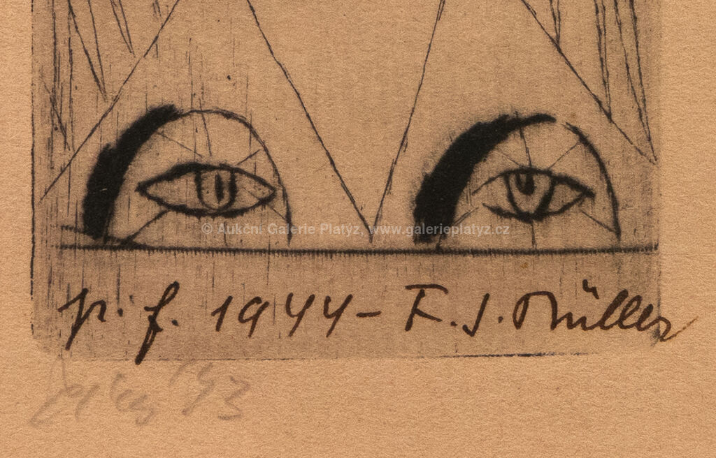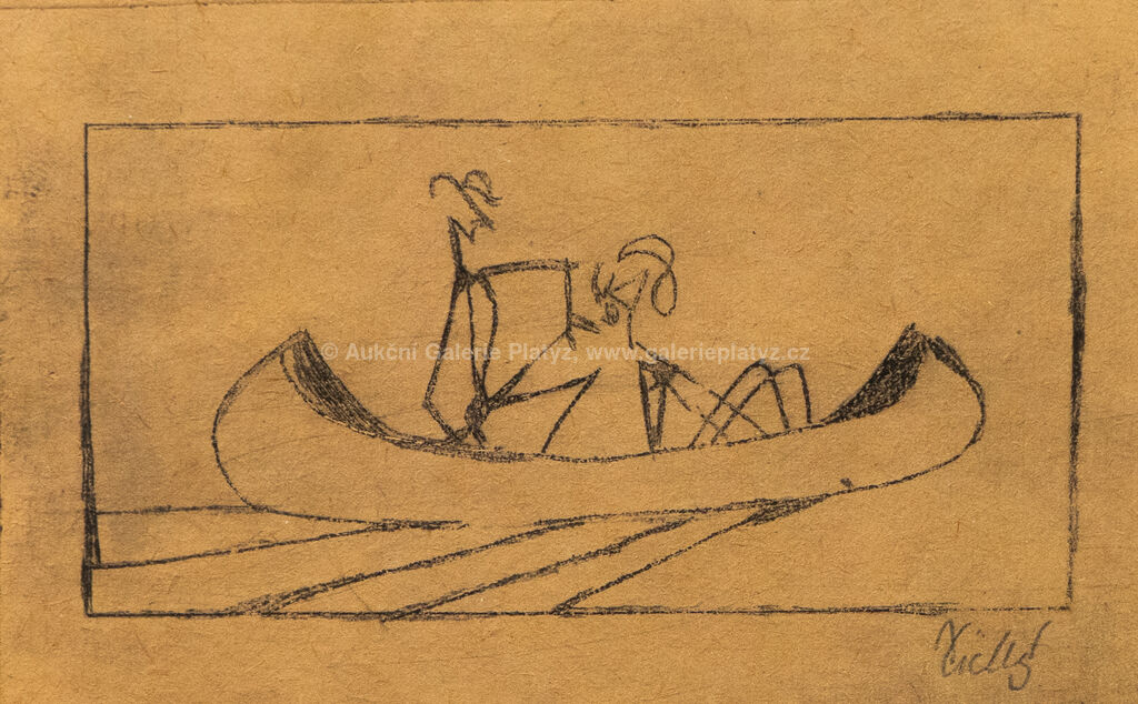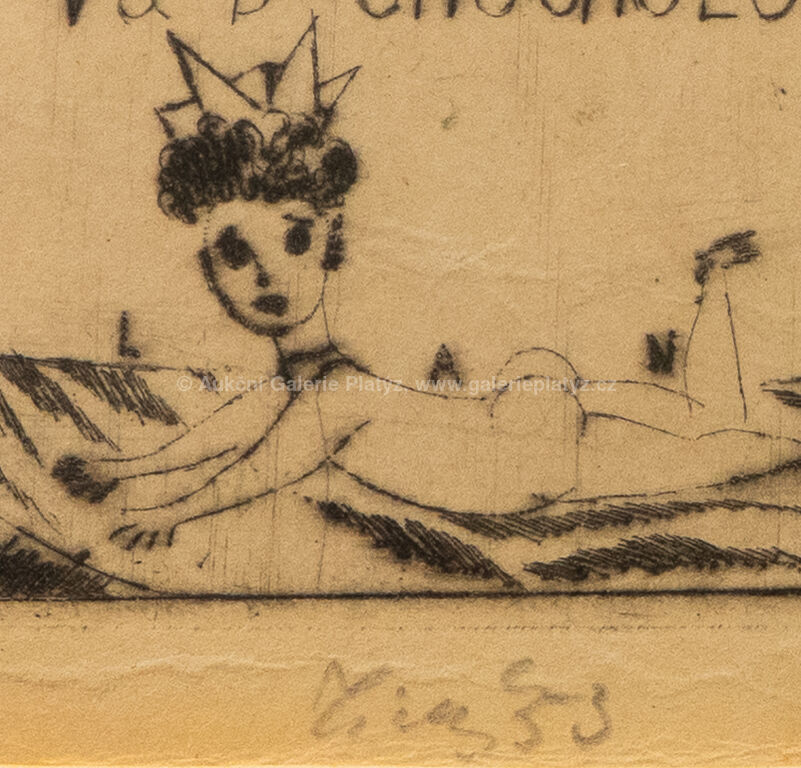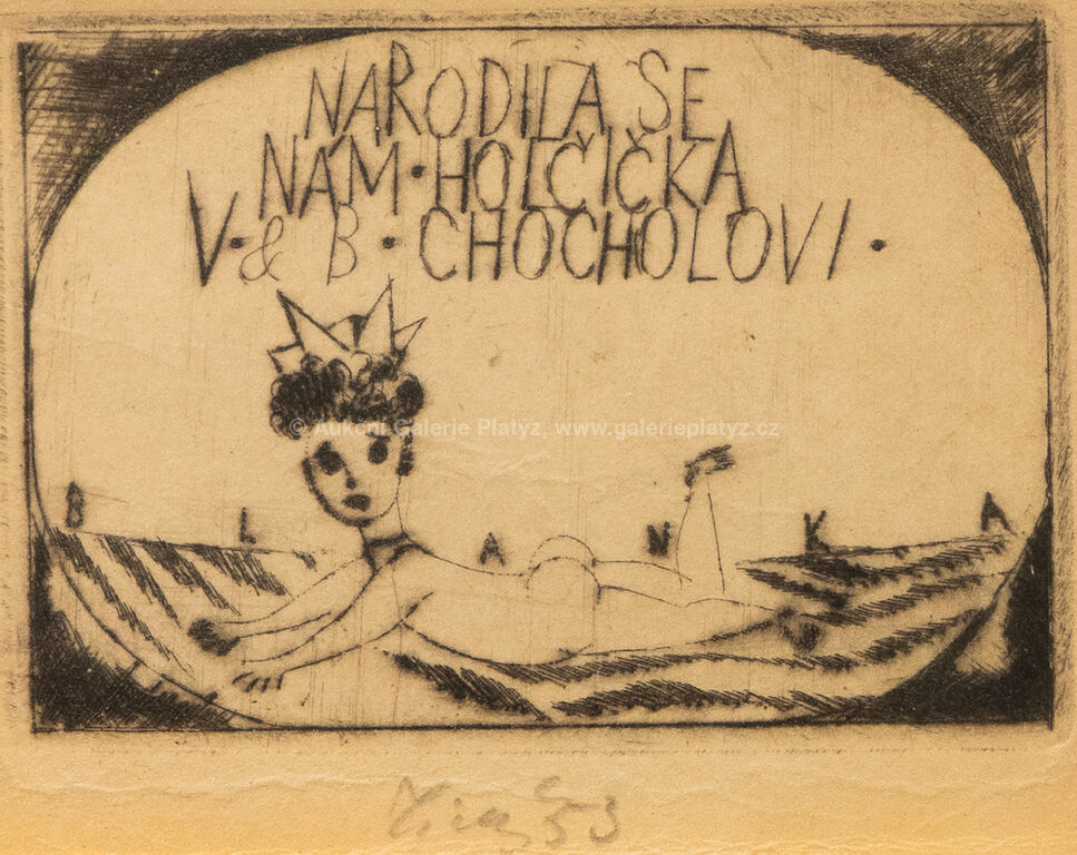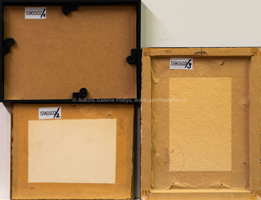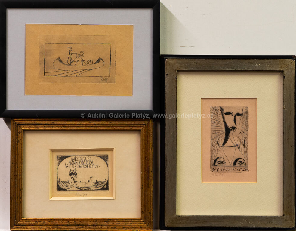 Loďka se dvěma veslaři: suchá jehla/papír, rozměr tiskové plochy 6,5 x 10,5 cm, značeno vpravo dole, zaskleno, rámováno, Narodila se holčička: suchá jehla/papír, rozměr ve výřezu 6 x 8 cm, značeno a datováno ve spodní části, paspartováno, zaskleno, rámováno, Novoročenka: suchá jehla/papír, rozměr ve výřezu 11,5 x 7,5 cm, značeno a datováno vlevo dole, paspartováno, zaskleno, rámováno, díla uvedena v soupisu graf. díla Fr. Tichého pod čísly 217, 249 a 103