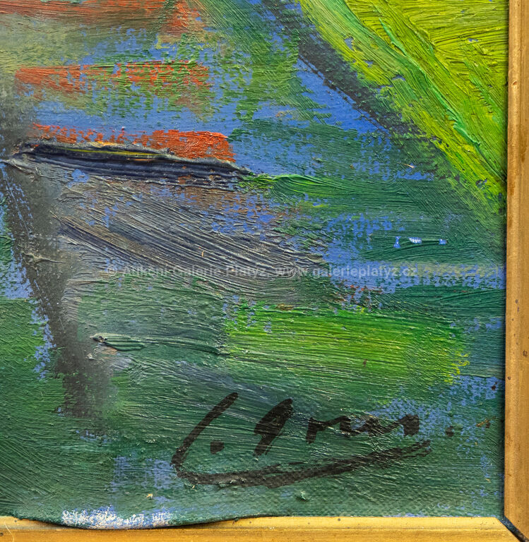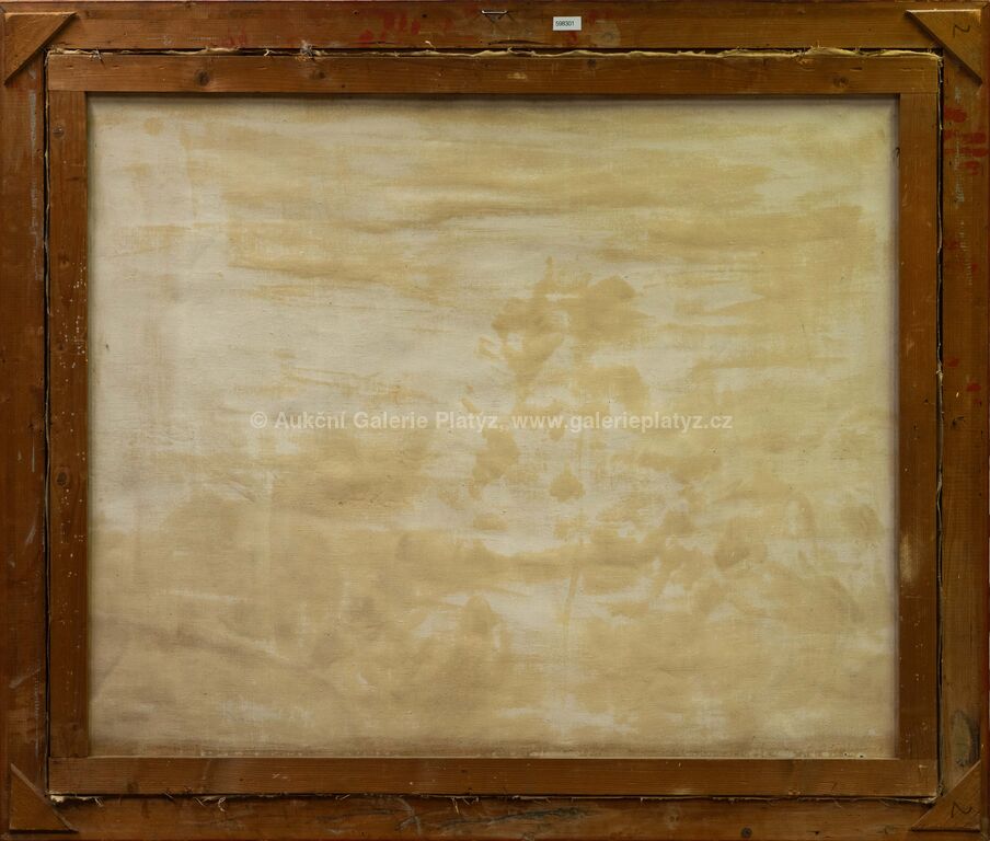 olej/plátno, rozměr 100 x 120 cm (VELKÝ FORMÁT), značeno a datováno ve spodní části, rámováno, poškozený rám, ve vrchní části drobné oděrky v malbě, skvrny od vlhkosti (viz foto), plátno místy uvolněné z napínacího rámu