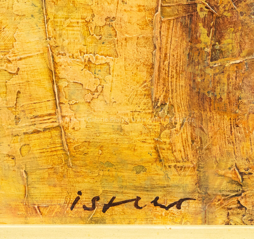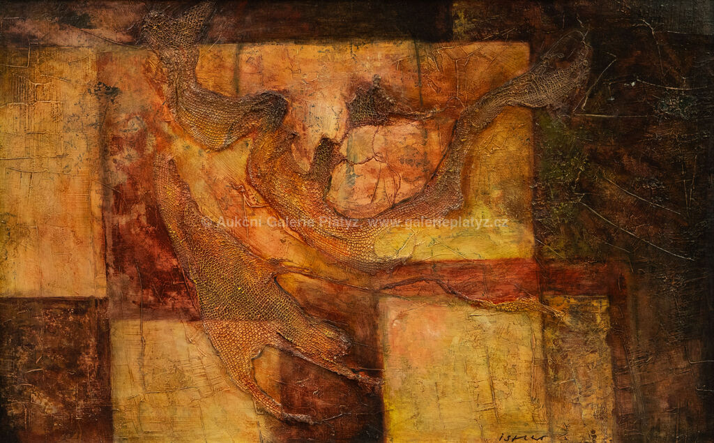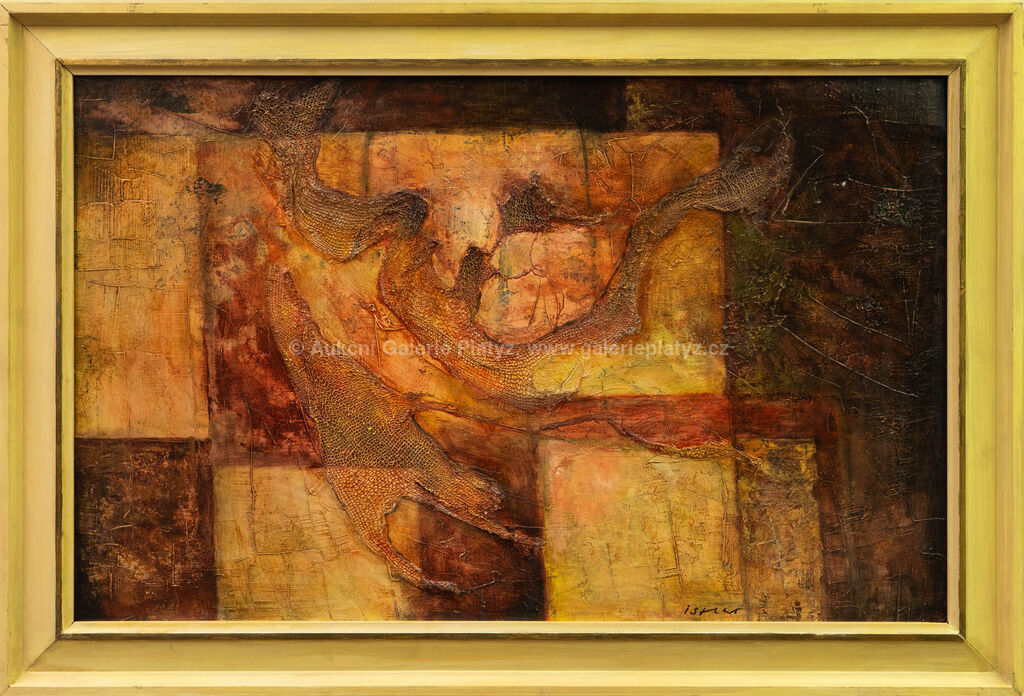 kombinovaná technika, olej/písek/tkanina, rozměr 50 x 80 cm, značeno vpravo dole, rámováno, oděrky na rámu