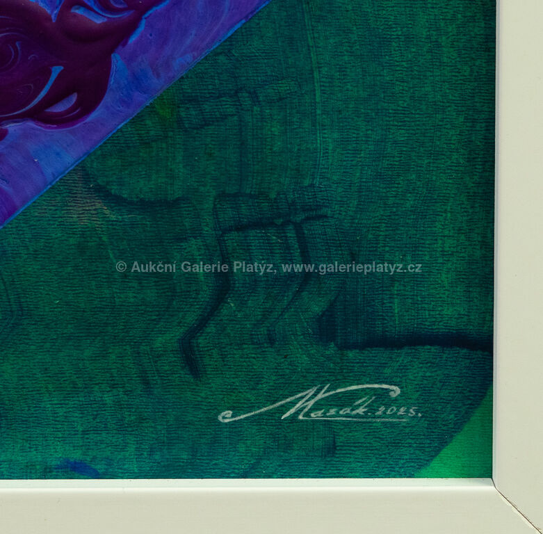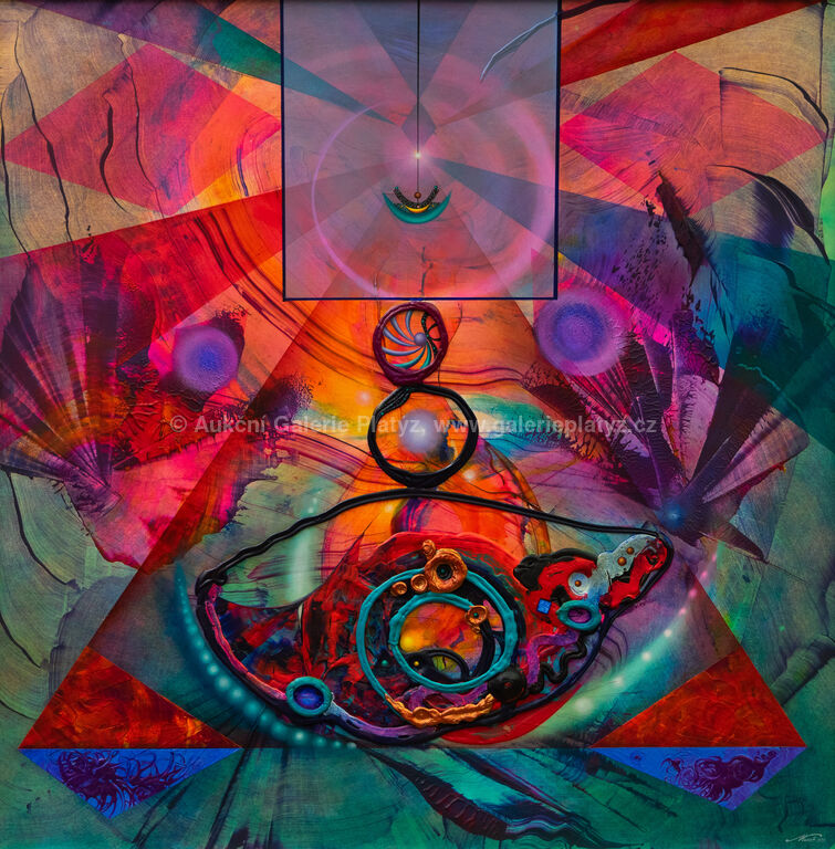 kombinovaná technika, olej/akryl/sololit, strukturální malba, rozměr 89 x 88 cm, značeno a datováno vpravo dole, rámováno