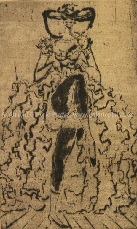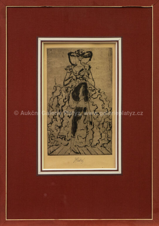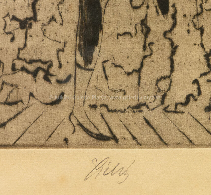 suchá jehla/papír, rozměr ve výřezu 25,5 x 14,5 cm, značeno ve spodní části, paspartováno, zaskleno, nerámováno, uvedeno v soupisu graf. díla Fr. Tichého pod číslem 250, str. 159, K autorově výstavě v Hollaru r. 1956 bylo z desky pořízeno 40 výtisků.
