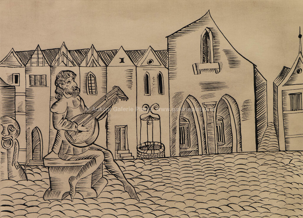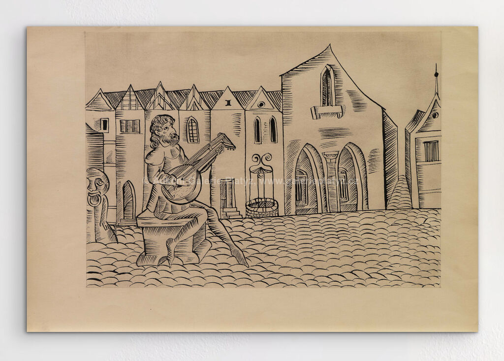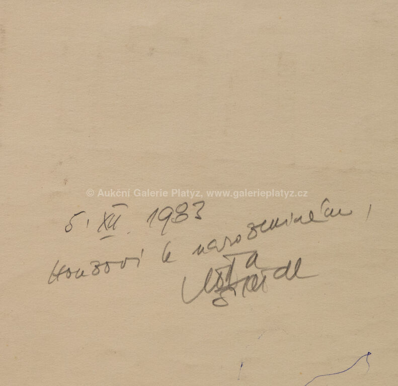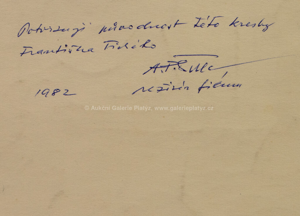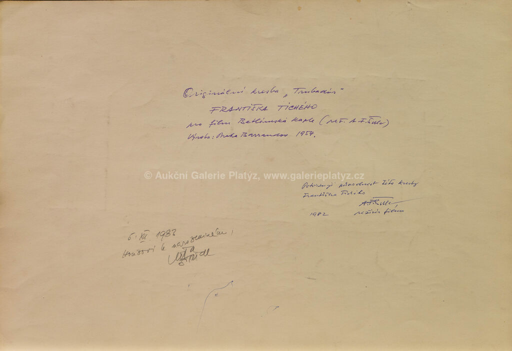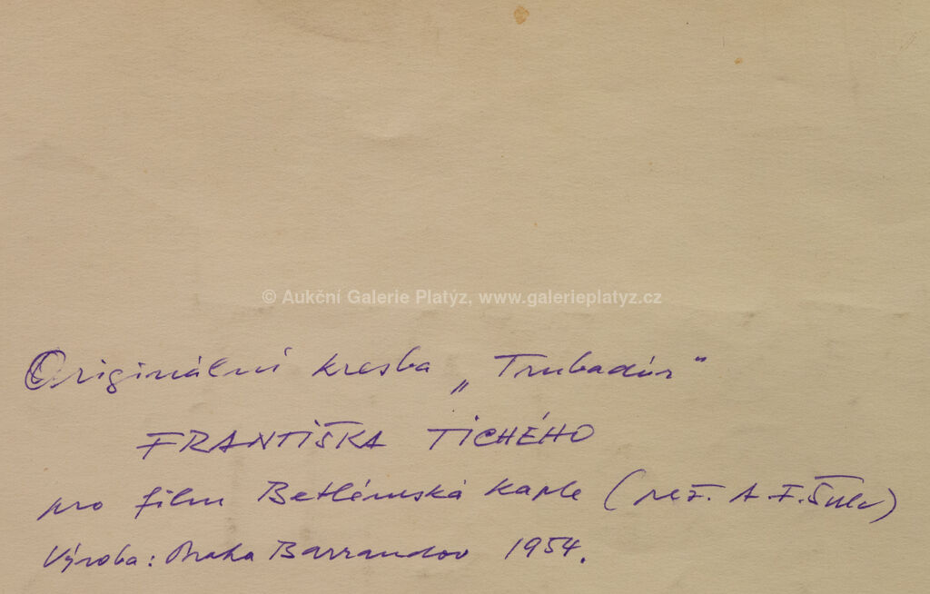 tuš/tužka/papír, rozměr listu 30 x 44 cm, neznačeno, popsáno na zadní straně, pravost díla potvrzena na zadní straně režisérem A. F. Šulcem, pro jehož film Betlémská kaple vzniklo