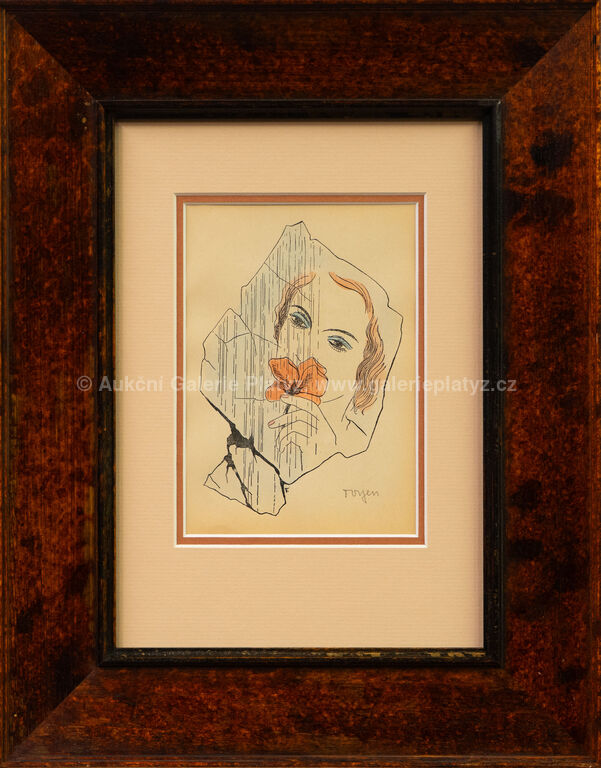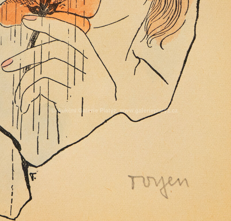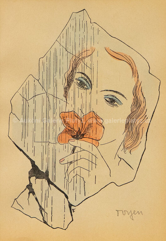 kolorovaná zinkografie/papír, rozměr ve výřezu 17,5 x 12,5 cm, značeno vpravo dole, paspartováno, zaskleno, rámováno