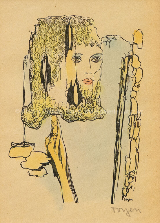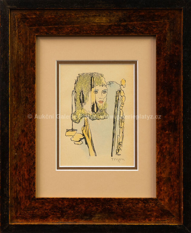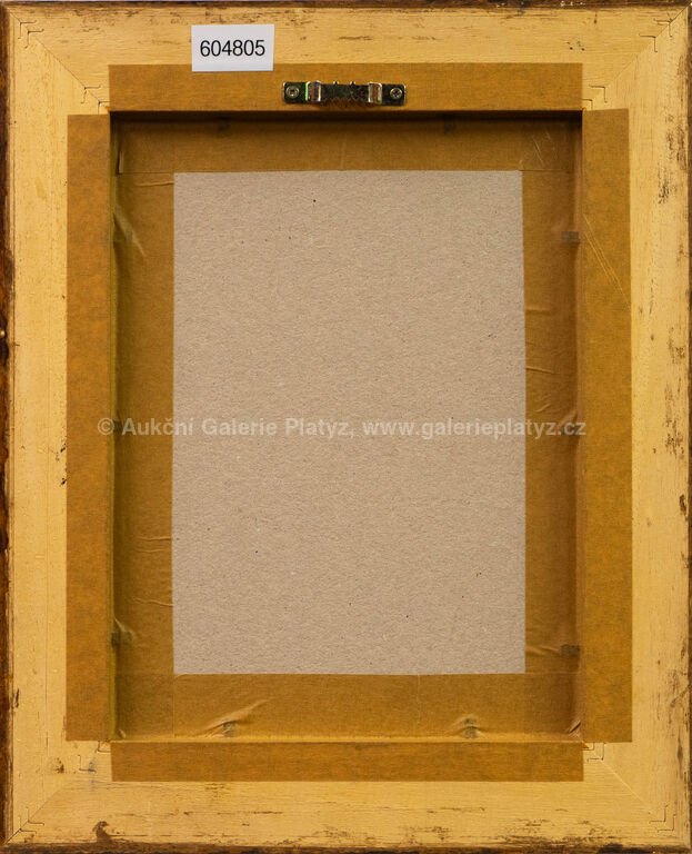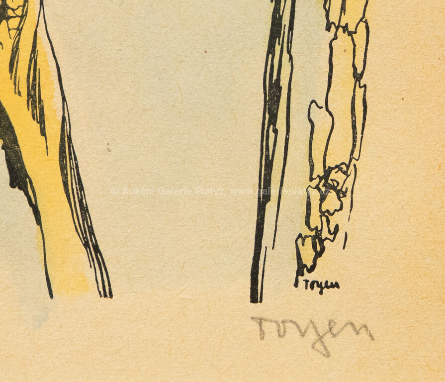 kolorovaná zinkografie/papír, rozměr ve výřezu 14 x 10,5 cm, značeno v tisku vpravo dole, značeno tužkou vpravo dole, paspartováno, zaskleno, rámováno