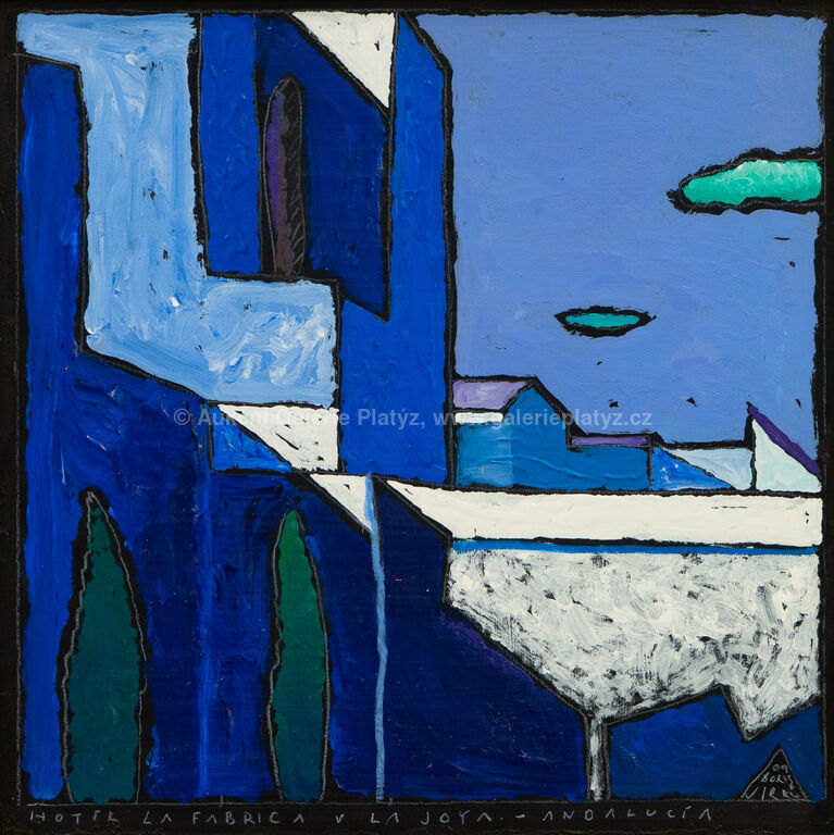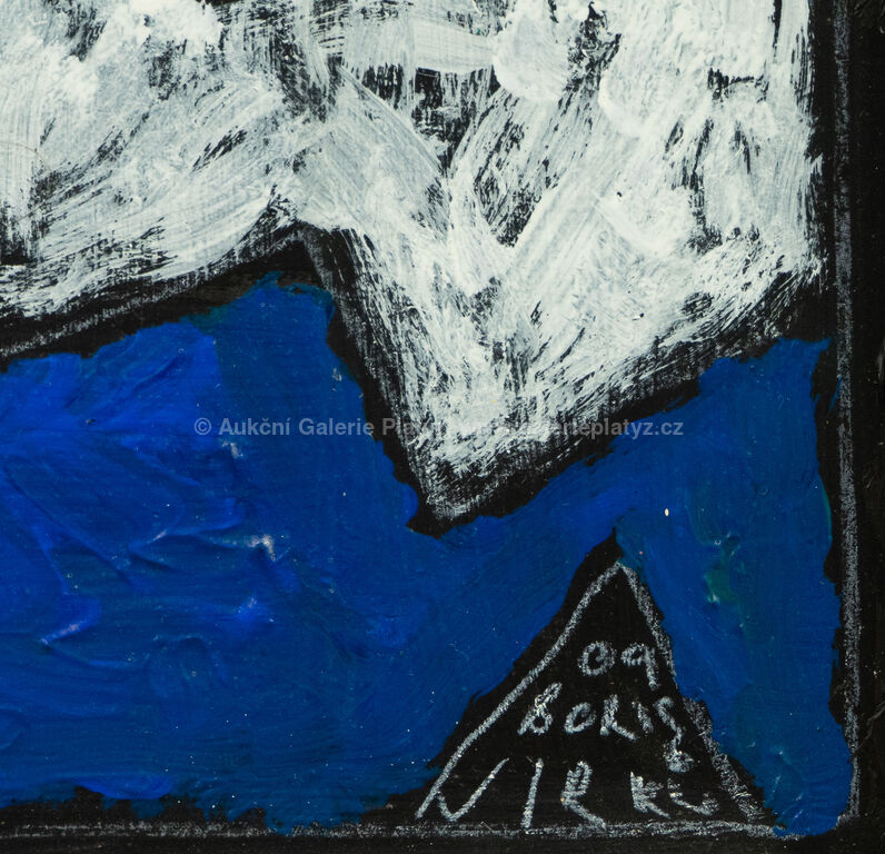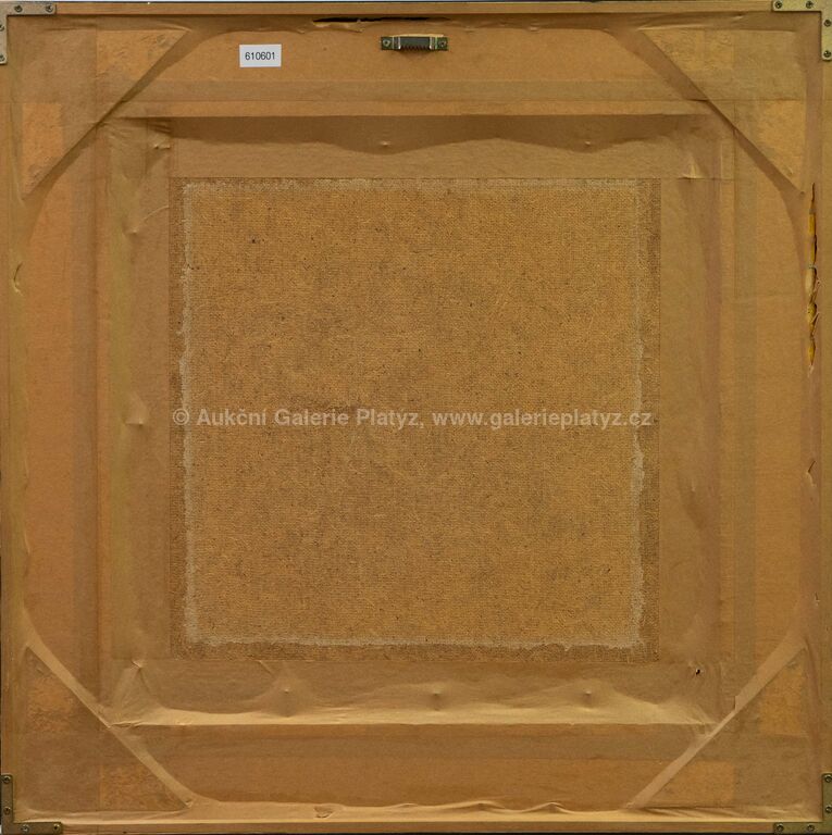 kombinovaná technika, akryl/voskový pastel/sololit, celkový rozměr včetně autorského rámu 66 x 66 cm, značeno, datováno a popsáno ve spodní části, zaskleno muzeálním sklem, rámováno, oděrky na rámu