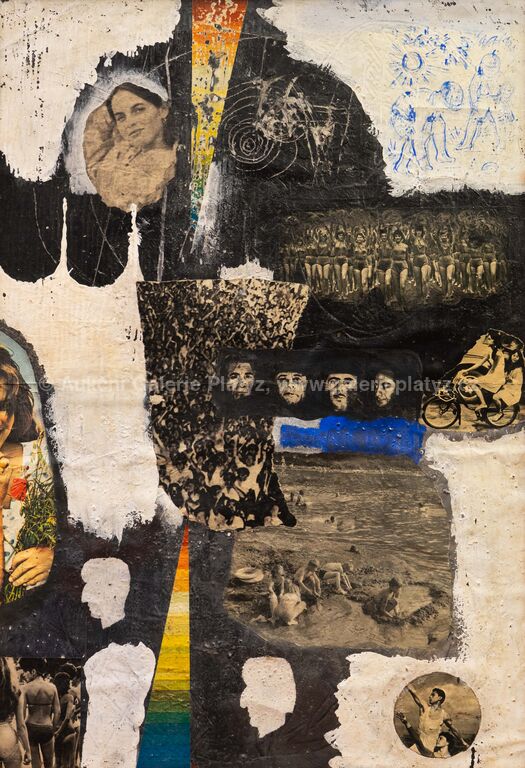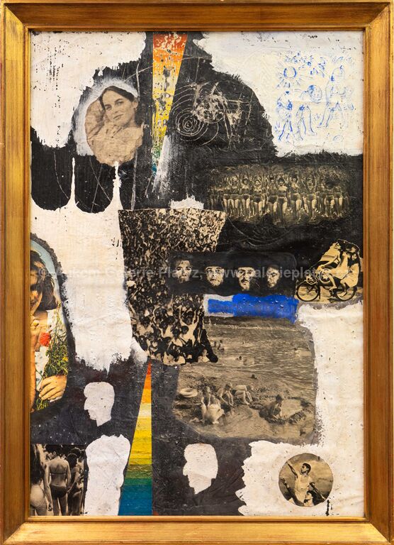 kombinovaná technika, koláž/karton, rozměr 90 x 62 cm, neznačeno, rámováno, oděrky na rámu