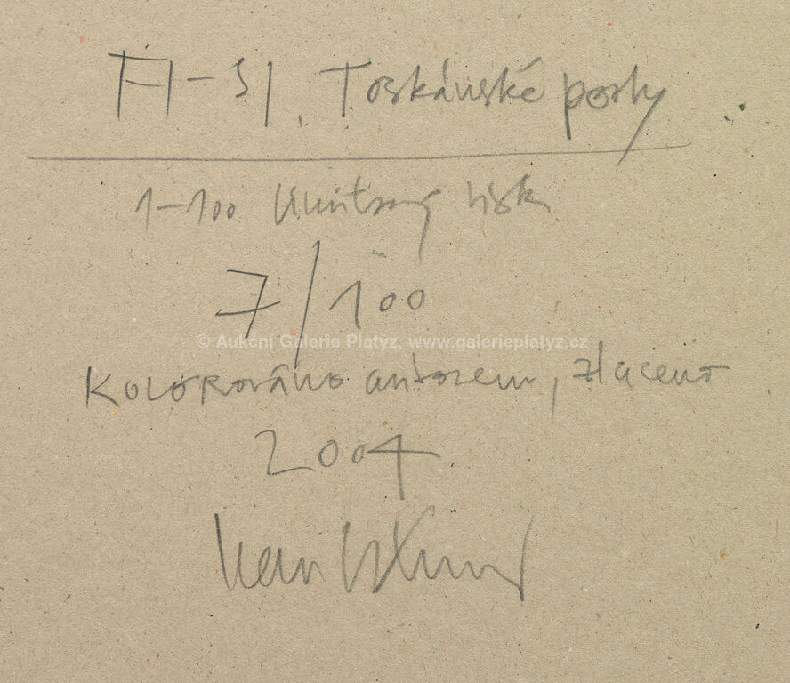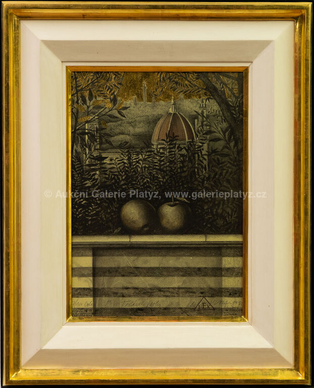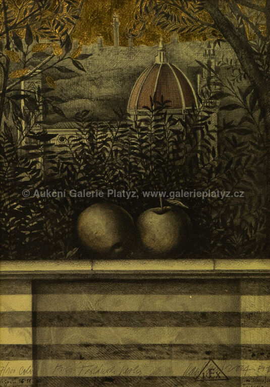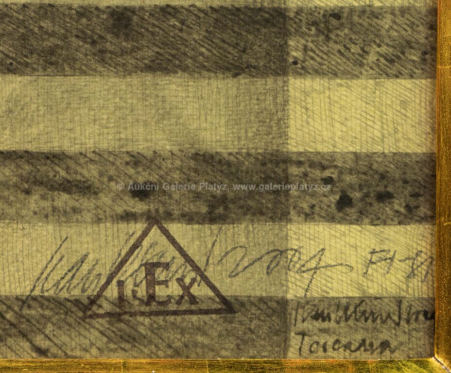 limitovaný tisk/papír, autorsky kolorováno, zlaceno, rozměr 41 x 29 cm, značeno, datováno, číslováno a popsáno ve spodní části, zaskleno, rámováno, oděrky na rámu