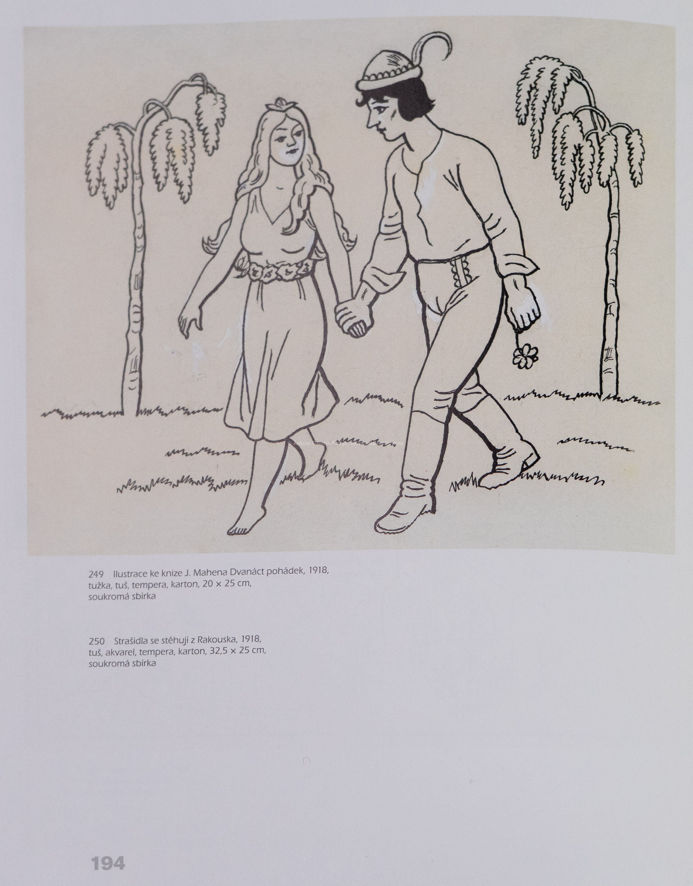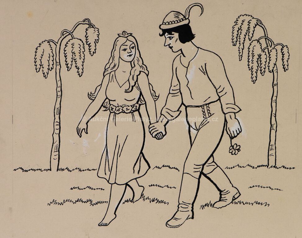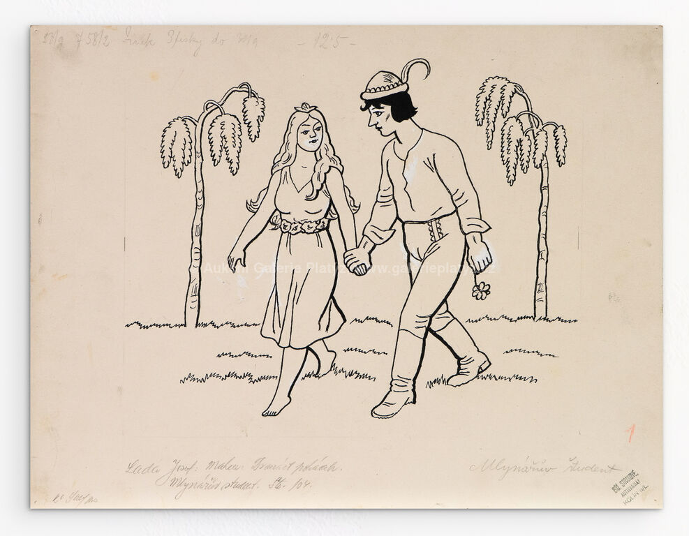 tuš/běloba/papír, rozměr listu 25 x 32,5 cm, neznačeno, popsáno ve spodní části, volně loženo, původní ilustrace, publikováno v knize Dvanáct pohádek, naps. Jiří Mahen, str. 104, kniha přiložena, dále uvedeno v monografii Lada na str. 194, vyd. nakl. Slovart 2016