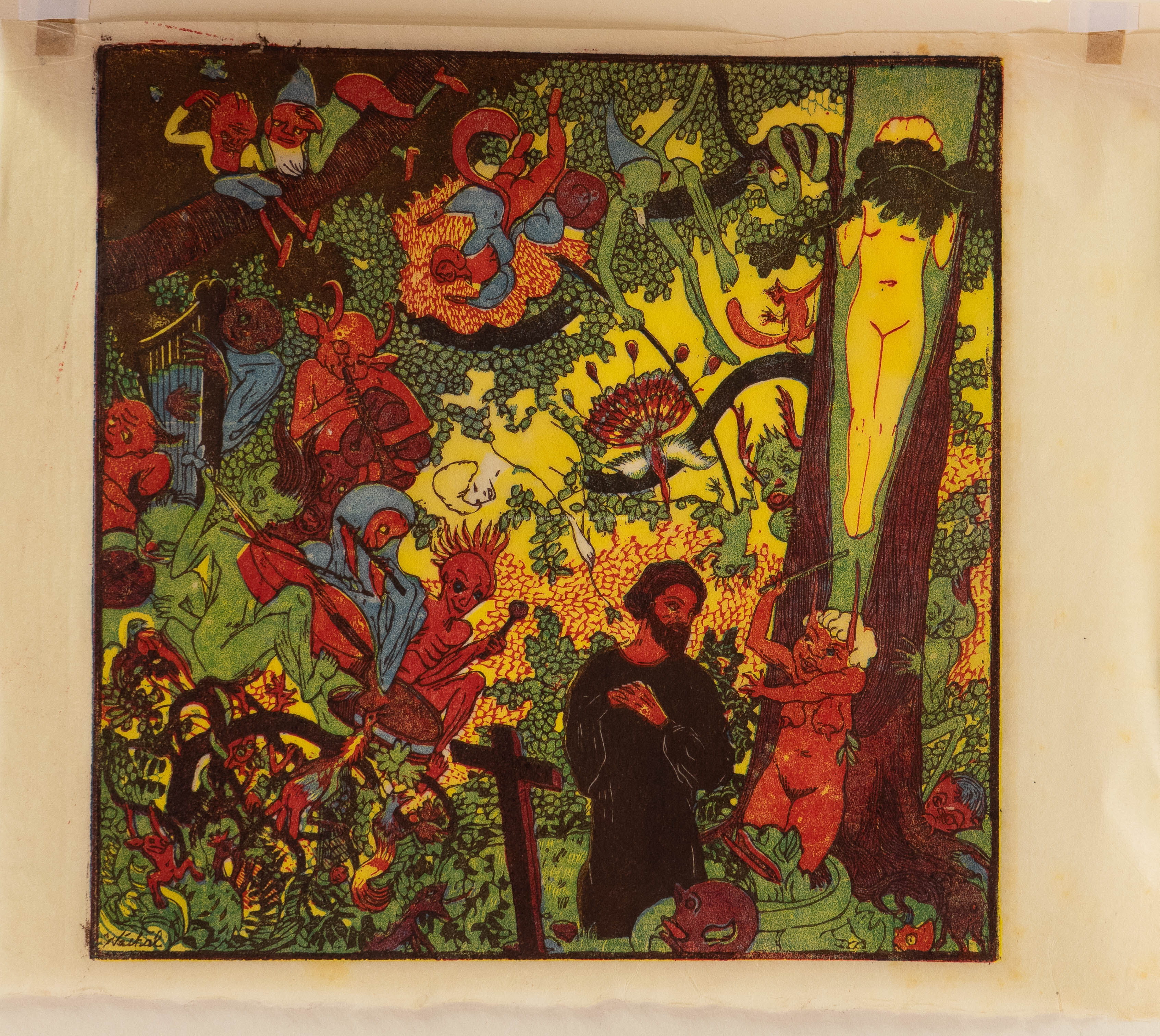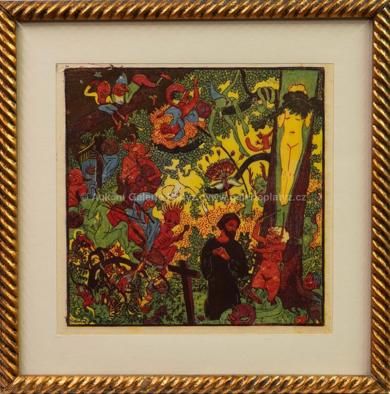 barevný dřevoryt/papír, rozměr ve výřezu 21 x 21,5 cm, značeno vlevo dole v tisku, paspartováno, zaskleno, rámováno