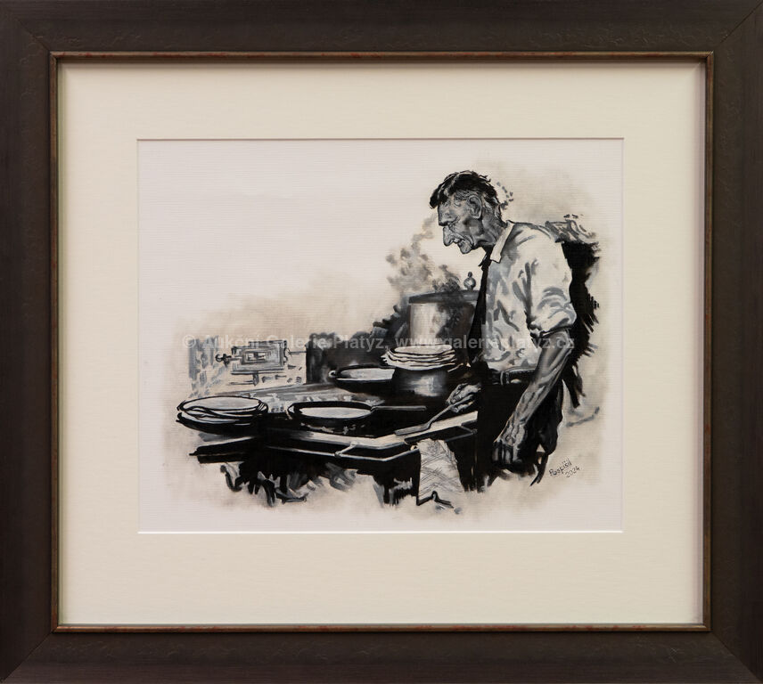 olej/plátno fixované na kartonu, rozměr ve výřezu 29,5 x 36,5 cm, značeno a datováno vpravo dole, paspartováno, zaskleno muzeálním sklem, rámováno, ilustrace na motivy Zdeňka Buriana z knihy Lovci kožišin, naps. Fr. Flos, přiloženo kompletní portfolio ilustrací vydané v limitovaném nákladu - vyd. Artrium Zlín, 2024