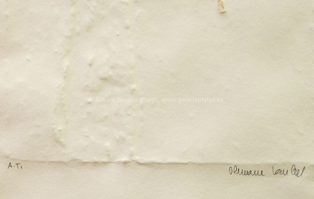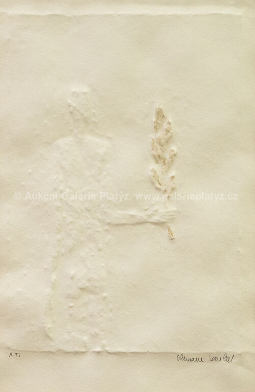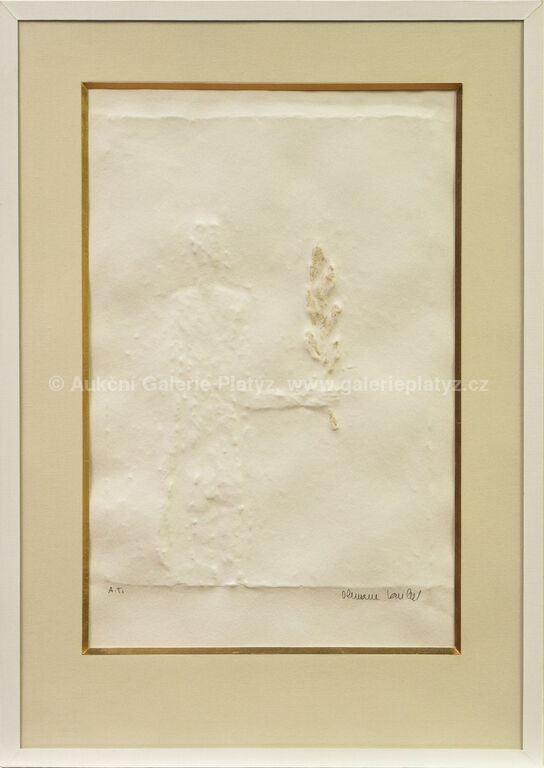 papírový reliéf/ruční papír/zlato, rozměr ve výřezu 35 x 23 cm, značeno a popsáno ve spodní části, paspartováno, zaskleno, konzultováno a pravost potvrzena Nadačním fondem Kmentová Zoubek