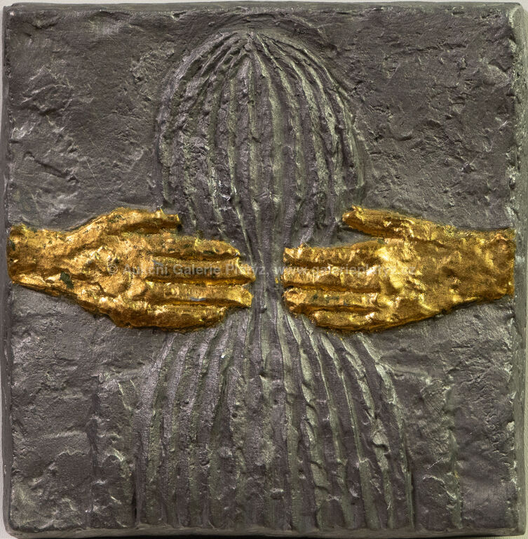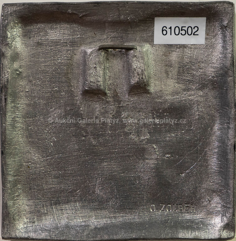 reliéf, olovo/cín/zlato, rozměr 16 x 15,5 cm, značeno na zadní straně, konzultováno a pravost potvrzena Nadačním fondem Kmentová Zoubek