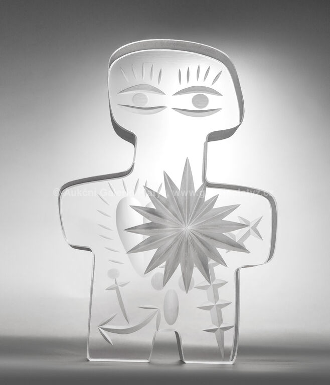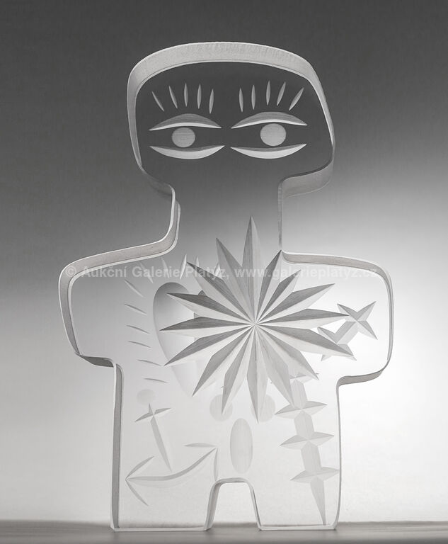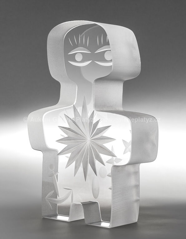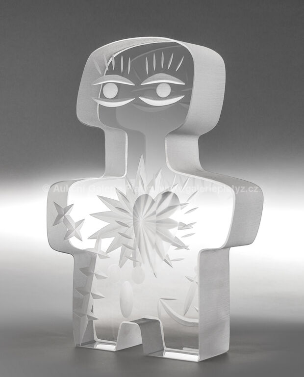 skleněná plastika, ručně broušený a matovaný křišťál, čirá barva, výška 20 cm, šířka 13,5 x 4,5 cm, neznačeno, design Rony Plesl, výroba Rückl, Nižbor