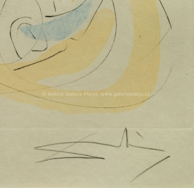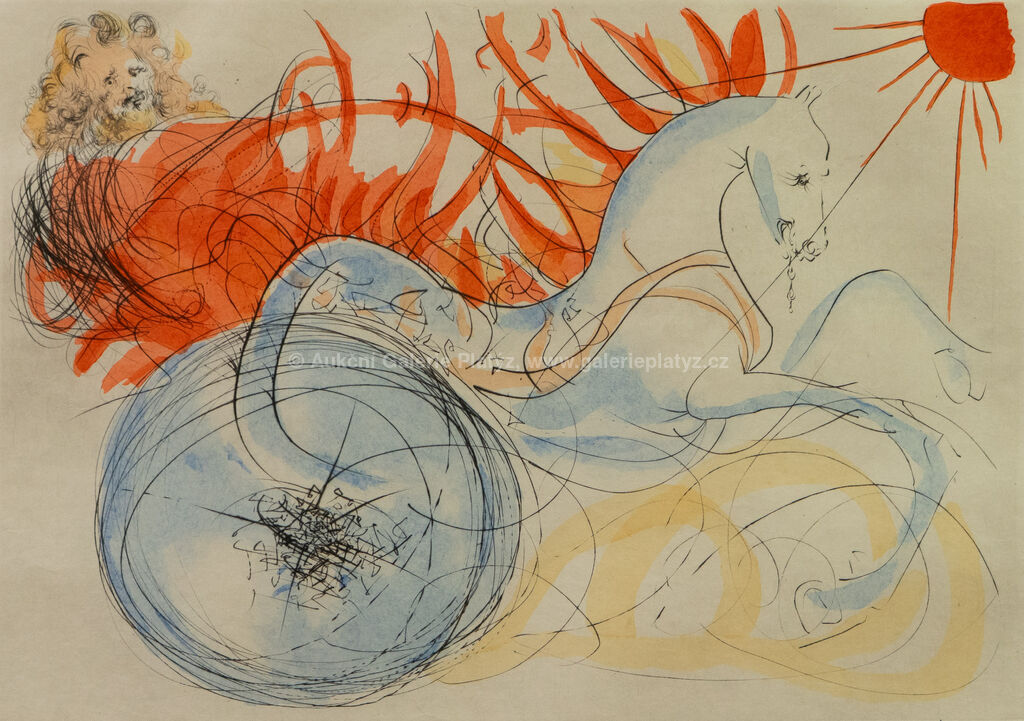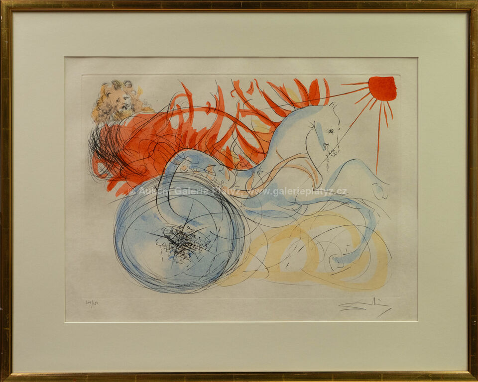 kolorovaný lept/ruční papír Japan, rozměr ve výřezu 47 x 63 cm, značeno a číslováno ve spodní části, paspartováno, zaskleno, rámováno, oděrky na rámu, uvedeno: A.Field: "The Official Catalogue of the Graphic Works of Salvador Dalí" No.75-4J p.101, 1996