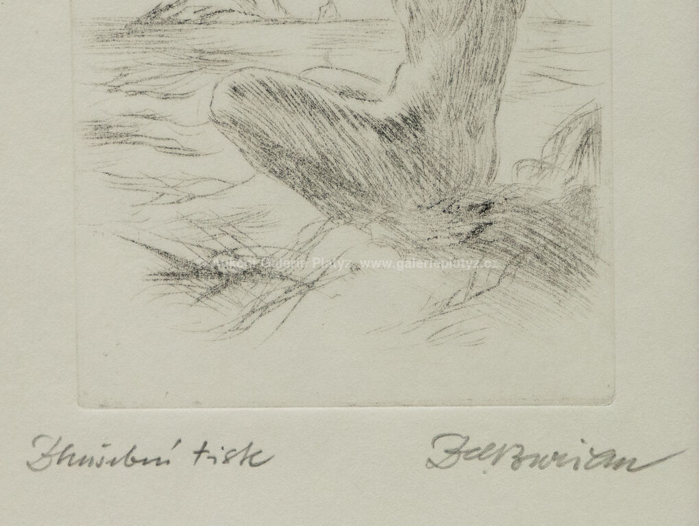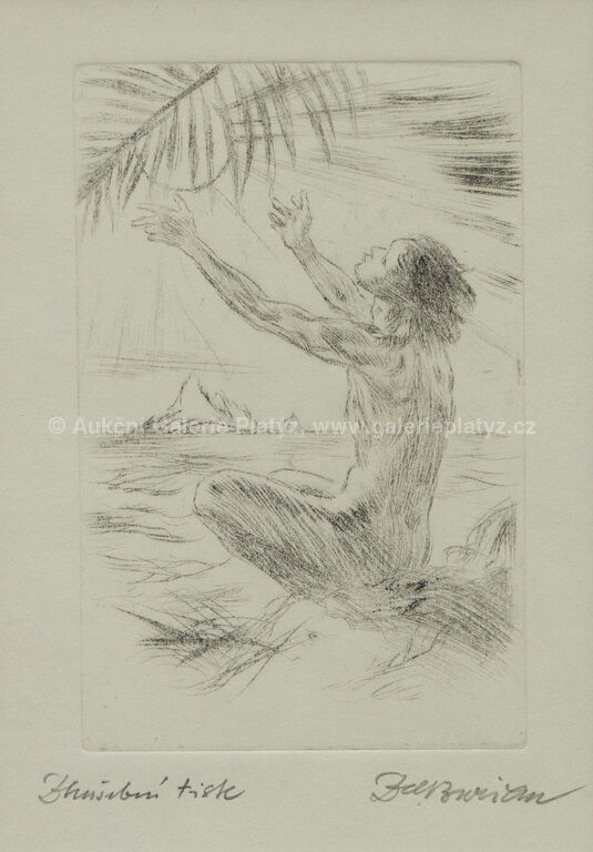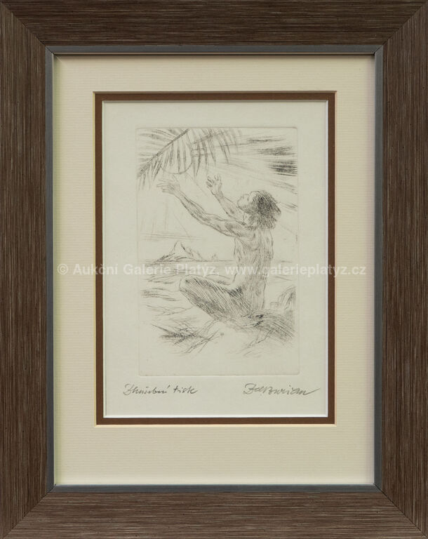 suchá jehla/papír, zkušební tisk, rozměr ve výřezu 17 x 12 cm, značeno a popsáno ve spodní části, paspartováno, zaskleno, rámováno, mimořádně výjimečné Burianovo dílo - jsou doloženy pouze dva motivy, které vznikly jako grafické listy. Píseň slunci je jedním z nich.